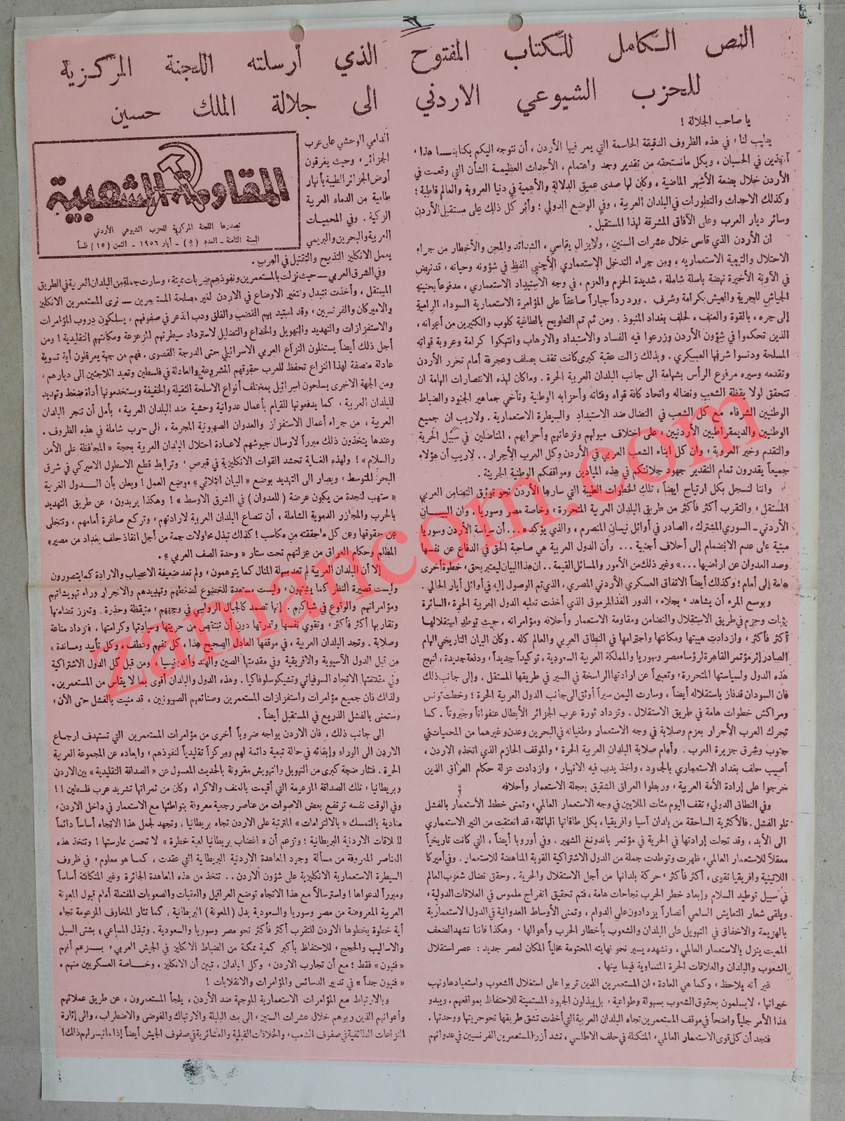 في هذا السياق، أرسلت اللجنة المركزية للحزب الشيوعي الأردني رسالة مفتوحة خصصت لها عدداً كاملاً من نشرة “المقاومة الشعبية” وهي الصحيفة المركزية للحزب آنذاك.
